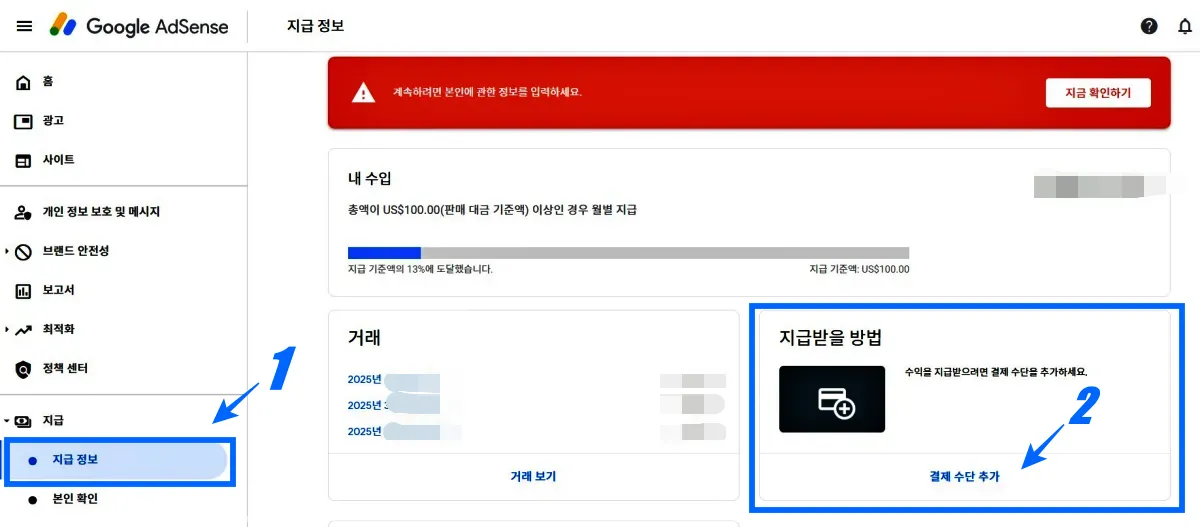 왼쪽 메뉴에서 '지급 > 지급 정보 > 지급받을 방법 > 결제 수단 추가'에 들어가면 됩니다.