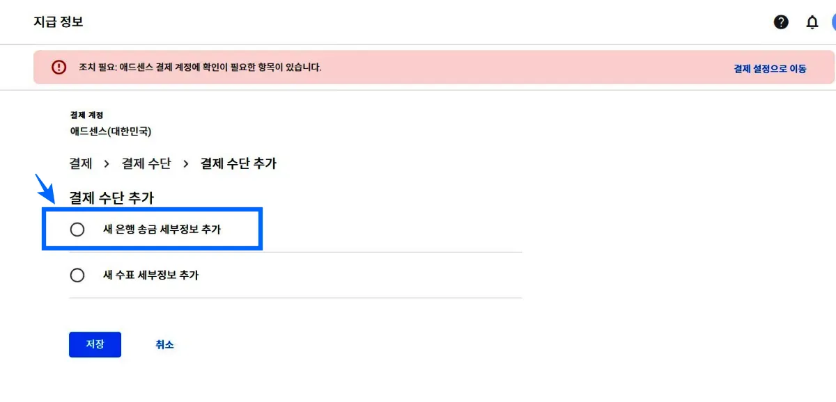 2. 새 은행 송금 세부정보 추가 클릭하기