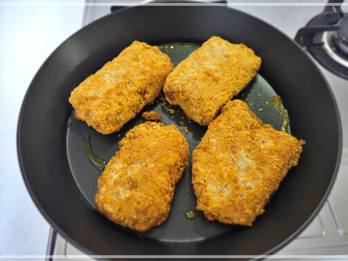 프라이팬에 요리하니까 냉동이라는 생각이 안 들더라고요. 식당보다 바삭하지는 않지만 충분히 바삭하고 맛있습니다.
