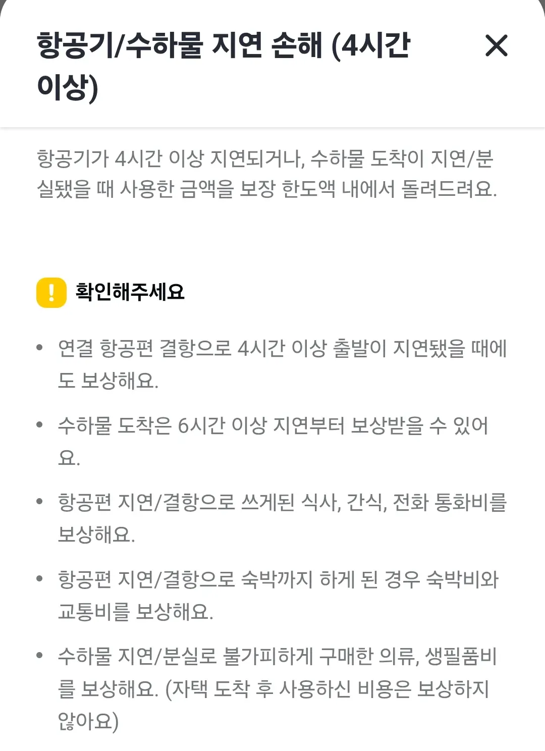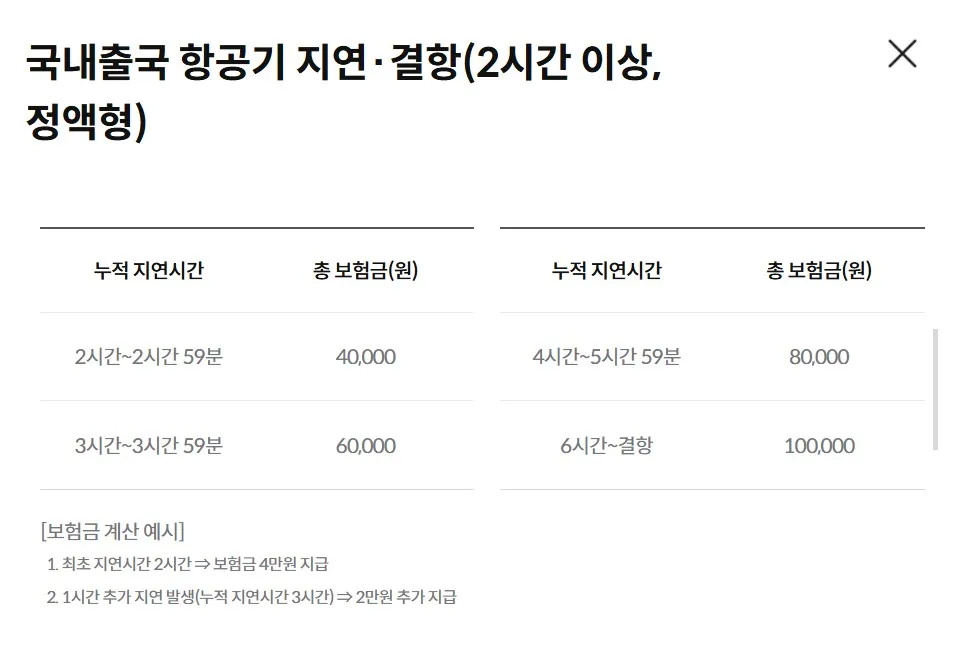 | 항공기 지연 | 2시간 이상 지연 시 보험금 지급 최대 6시간 보장 정액보상 |